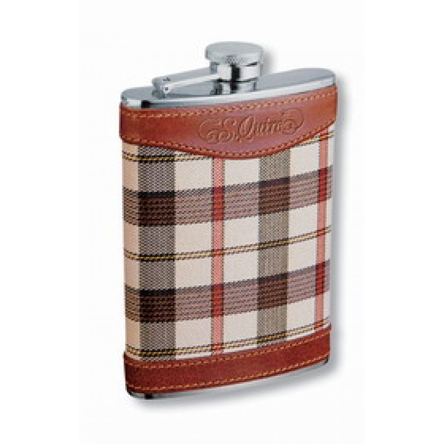 Фляга S.Quire 0,24 л, сталь + кожа, вставка из ткани в коричневую клетку