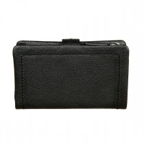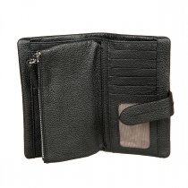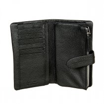 Портмоне закрывается клапаном на кнопке. Внутри два отделения для купюр, отдел для монет на молнии, три кармана для документов, один потайной карман, двенадцать кармашков для пластиковых карт. Оснащено RFID Protection (защитным слоем от считывания карт)