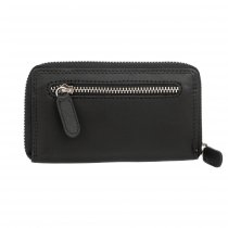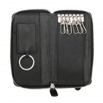 Чёрная кожаная ключница от бренда Gianni Conti. Закрывается на молнию. Внутри шесть карабинов для ключей и съёмный кожаный брелок с кольцом, крепится на две кнопки. Цвет фурнитуры - серебро.