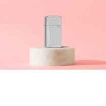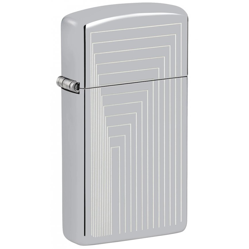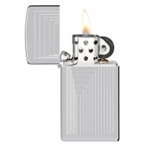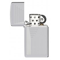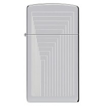 Эта ослепительная зажигалка Slim® High Polish Chrome украшена лазерной гравировкой в виде успокаивающего абстрактного узора.