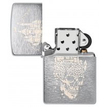 На этой классической зажигалке с матовым хромированным покрытием величественно возвышается замок. Скалистые вершины гор сменяются ухмыляющимся черепом, изображенным в замысловатом узоре, выполненном лазерной гравировкой.
