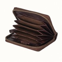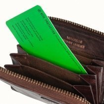 Визитница выполнена из натуральной кожи. Закрывается на молнию по периметру. Внутри семь кармашков для пластиковых карт.