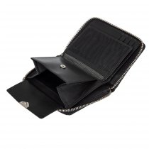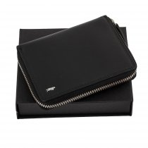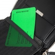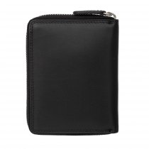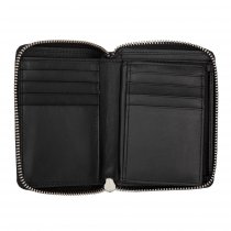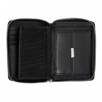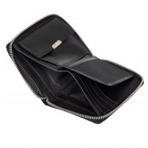 Портмоне выполнено из натуральной кожи черного цвета. Закрывается на молнию. Внутри 2 отделения для купюр, отделение для мелочи на кнопке, 8 кармашков для пластиковых карт, 3 потайных кармана, сетчатый карман для пропуска Размеры: 10 х 13 х 2 см.